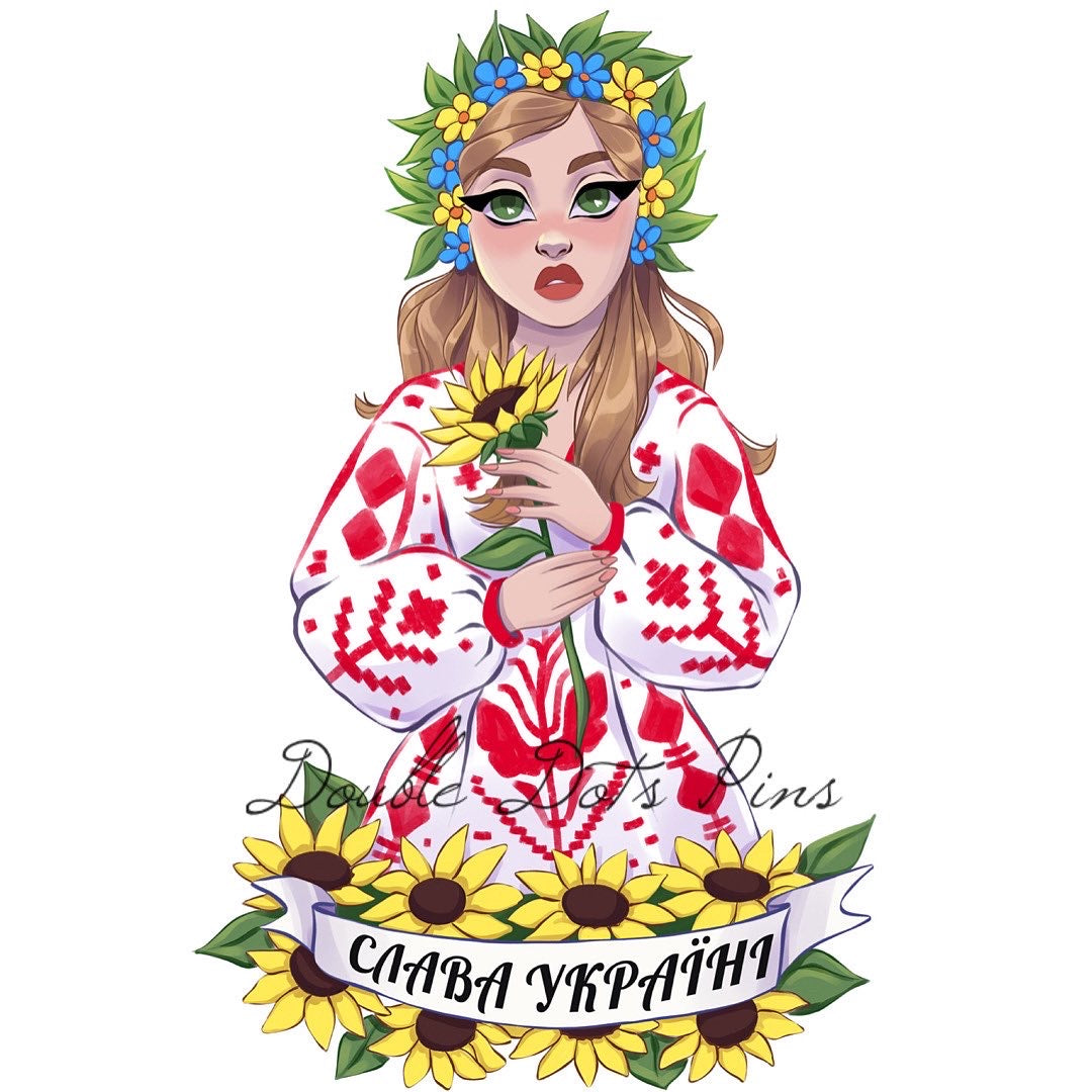 Thank you so much for checking out my charity pin to benefit Ukraine! In this design, Yelena wears traditional Ukrainian clothing with a banner that translates to "Glory to Ukraine!" This motto has been used for over a hundred years, offering hope for an independent and peaceful Ukraine.